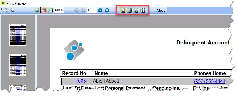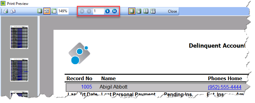 - Prior/Next Page: Quickly go through pages of the report. Also use the thumbnails on the left to select any page to view.